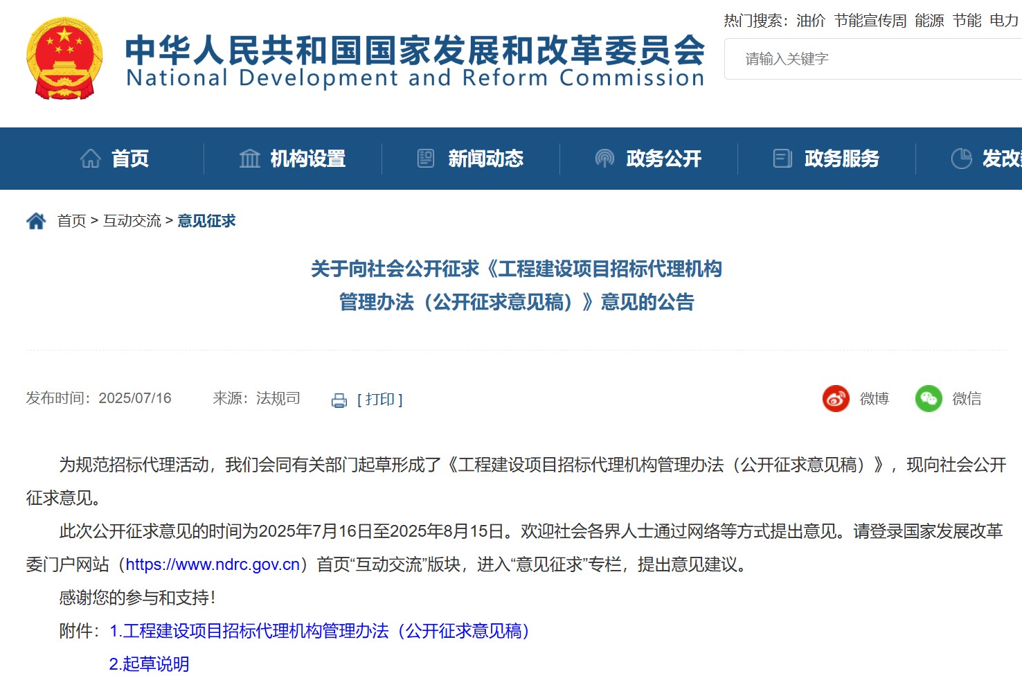 國家發(fā)展和改革委員會向社會公開征求《工程建設(shè)項目招標(biāo)代理機構(gòu)管理辦法(公開征求意見稿)》意見